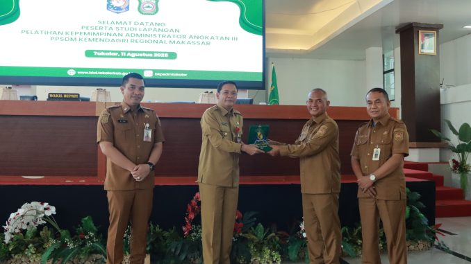 harian-pagi.com.—-Wakil Bupati Takalar Dr. H. Hengky Yasin, S. Sos,. MM menerima Peserta Studi Lapangan Pelatihan Kepemimpinan Administrator Angkatan III PPSDM Kemendagri Regional Makassar di Ruang Pola Kantor Bupati Takalar, Senin 11 Agustus 2025.