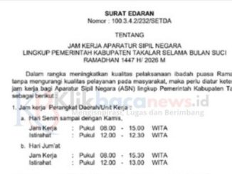 harian-pagi.com.—-Pemerintah Kabupaten Takalar resmi menetapkan penyesuaian jam kerja Aparatur Sipil Negara (ASN) selama Bulan Suci Ramadhan 1447 Hijriah/2026 Masehi. Kebijakan tersebut tertuang dalam Surat Edaran […]